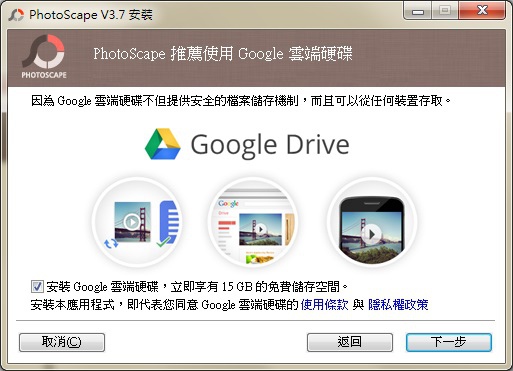 2.勾選是否需要安裝GOOGLE雲端硬碟