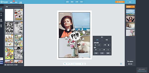 優點:效果不錯、蠻實用的功能、中文介面、提供很多模板使用、可以臉書載入圖片