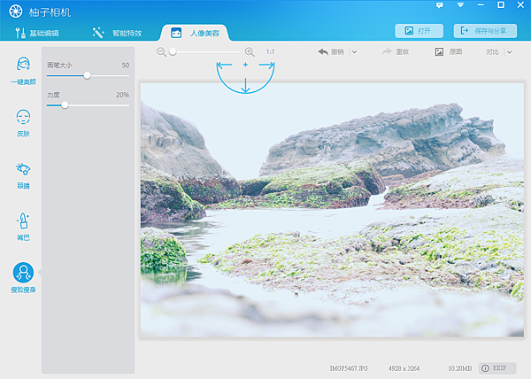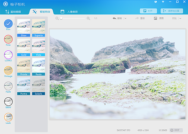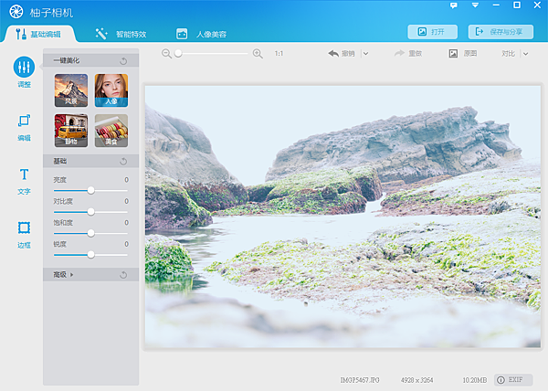 柚子相機是多尼換蘋果手機後才接觸到的一套APP拍照軟體,偶然發現柚子相機有出WIN版本,試著完了一下這套軟體後發現不錯使用,跟「光影魔術手」十分相似,但操作上比光影更簡單一點,大致功能分成三類基本編輯、智能特效、人像美容,這三個部份。