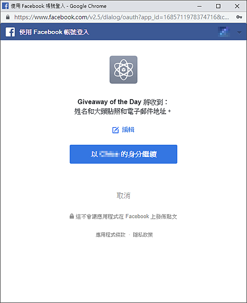 步驟三、用自己臉書,讓「Giveaway of the Day 」收取姓名、大頭貼、電子郵件